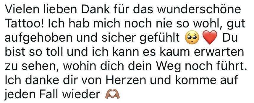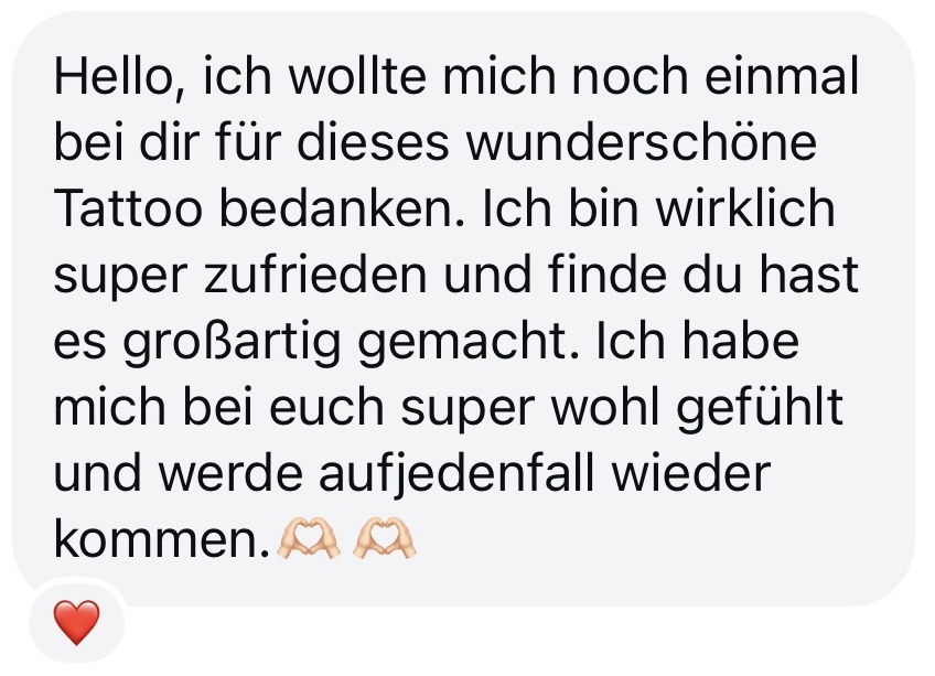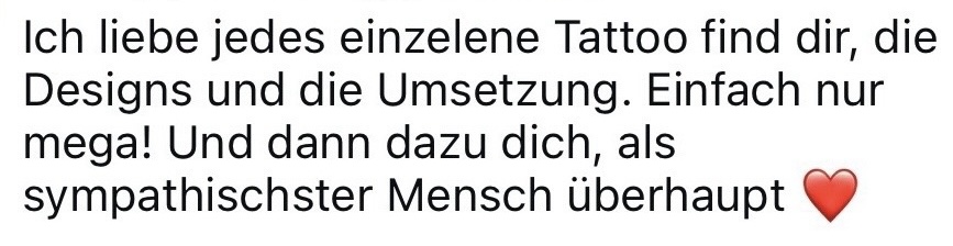 Meine Arbeit mit meinen Kunden basiert auf Vertrauen und Nähe. Ich achte darauf, dass sich jeder Kunde vom ersten Moment an wohl fühlt. Vor der Sitzung stelle ich sicher, dass das Design klar ist und bereit für die Umsetzung – so können sich meine Kunden sicher und entspannt auf das Tattoo-Erlebnis freuen. Ich bin davon überzeugt, dass eine gute Vorbereitung und offene Kommunikation der Schlüssel zu einem großartigen Ergebnis sind.